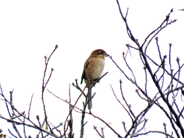 大沢池、ヒドリガモは10羽ほど残っていたが、オカヨシガモは帰ったようで姿がなかった。庭園の葉桜にシメ1羽、我々の目線に構うことなく採餌に一生懸命、しばらくしてやっと迷惑そうな顔をこちらに向けた。