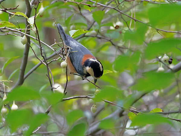 大覚寺の事務所の屋根にイソヒヨドリの♀の若1羽がこちらを見ている。垣根上の入り口を入りすぐの川にはヤマガラが。前回の探鳥会には見られなかったヒドリガモが2羽、舟着き場でむかえてくれ、更に池の奥からは5羽も手前までよってきた。