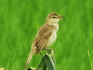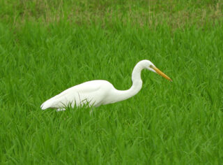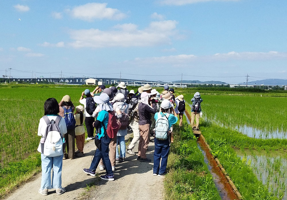 トウモロコシ畑ではオオヨシキリやセッカの姿と声をしっかり観察していただきました。終盤、またしてもサギの群れに遭遇し、双眼鏡で確認すると頭が飴(あめ)色の7羽と白色の2羽からなるアマサギの群れ。数が減少している最近ではなかなか見られない光景でした。