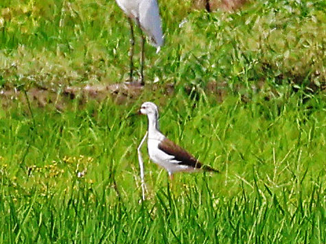 そのセイタカシギは、前日の下見では確認しましたが、当日集合前の下見では不在。それでも後半にその場所へ行くと、農道を隔てた向かい側の畑にダイサギ、チュウサギ、コサギ、アマサギ、ケリに交じってセイタカシギがいました。この鳥の特徴である長い足は草陰に隠れてほとんど見えなかったものの、初めて見た方も多く、本日のハイライトとなりました。