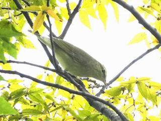 桜広場では散らばって木々の枝の小鳥を探します。キビタキ♀、コサメビタキ、ムシクイが何度も姿を見せ、ようやく探鳥会らしくなりました。ムシクイはメボソムシクイ類と思われましたが、地鳴きで判定することが出来ず「.sp」となりました。