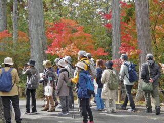 曼殊院前では色づき始めたモミジが美しく、しばし写真タイム。石垣では、みんなで準絶滅危惧種のキシノウエトタテグモの巣を探した。鳥の数は少なかったが、いろんな発見や意見も飛び交い、鳥に関わる木の実や虫との関係を楽しく観察することができた。