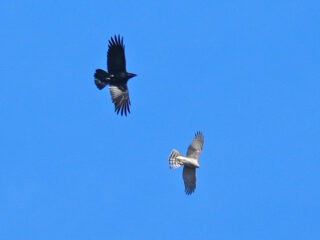 移動の途中、ハイタカがカラスに攻撃されていました。カラスが1羽のためかハイタカは余裕で相手をかわしながら飛んでいたので、わりと長時間見ることができました。