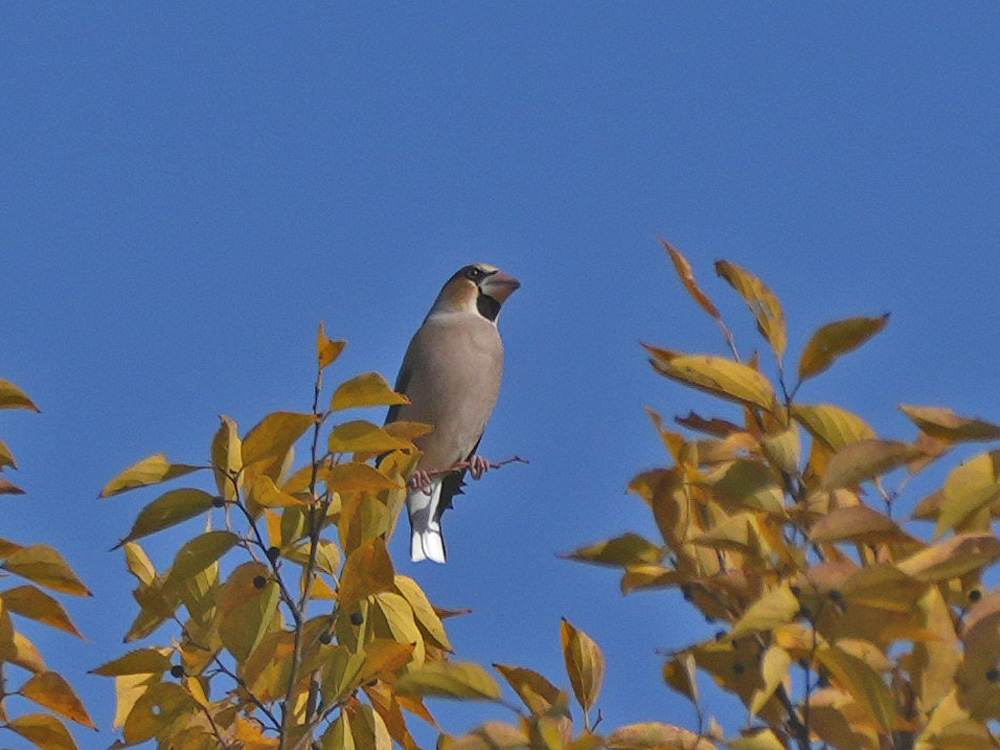 近衛邸跡に入ると1羽のシメが木の頂で長時間止まっていてくれて、十分に観察することができました。