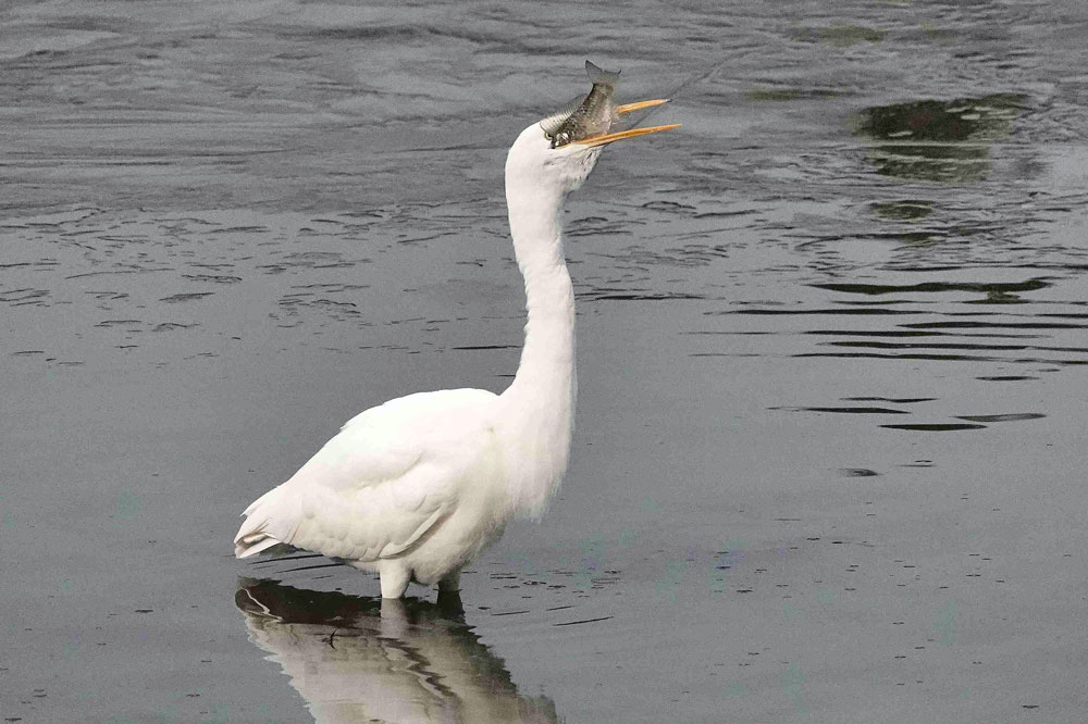 大沢池は水が抜かれてわずかに残った水面にダイサギとアオサギが立っている、見ているとダイサギが水中に嘴を刺し入れ大型の獲物をゲット。悪戦苦闘しながらもうまく飲み込み、獲物が食道を移動していく一部始終を観察。余談ながら隣にいたアオサギは微動だにせず、目さえくれない。