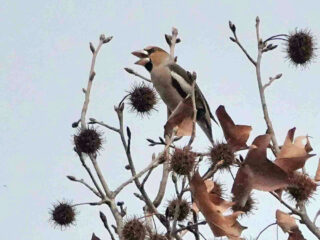 フウの木に小鳥たちが群がっているのでスコープを向けると、ツグミ、イカル、シメ、カワラヒワを発見。別々の小群なので入れ替わりやってくる。満員御礼。早くも時間は大幅にオーバー。