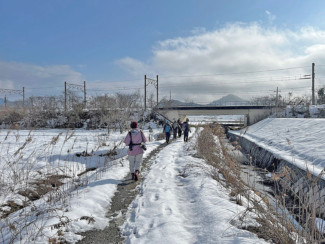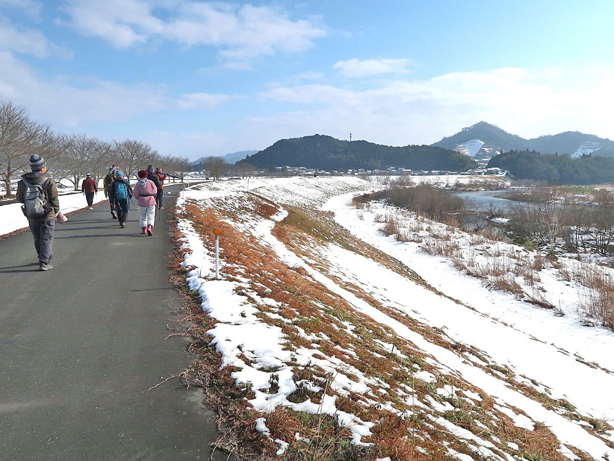 次に由良川沿いの堤防でコガモやノスリなどを見て歩きますが、舗装していない所や残雪の道もあり、防水でない靴だと水が染みてしまうので、そろそろと歩いて行きます。