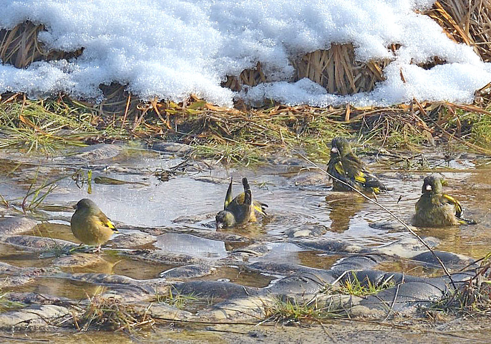 由良川の支流にかかる橋の上ではムクドリの群れ、また川の寄洲の残雪上で餌取りをしているアオジ、カシラダカ、ベニマシコの群れを観察しました。今回は高い場所から小鳥たちを見下ろして観察する機会が多かったようです。