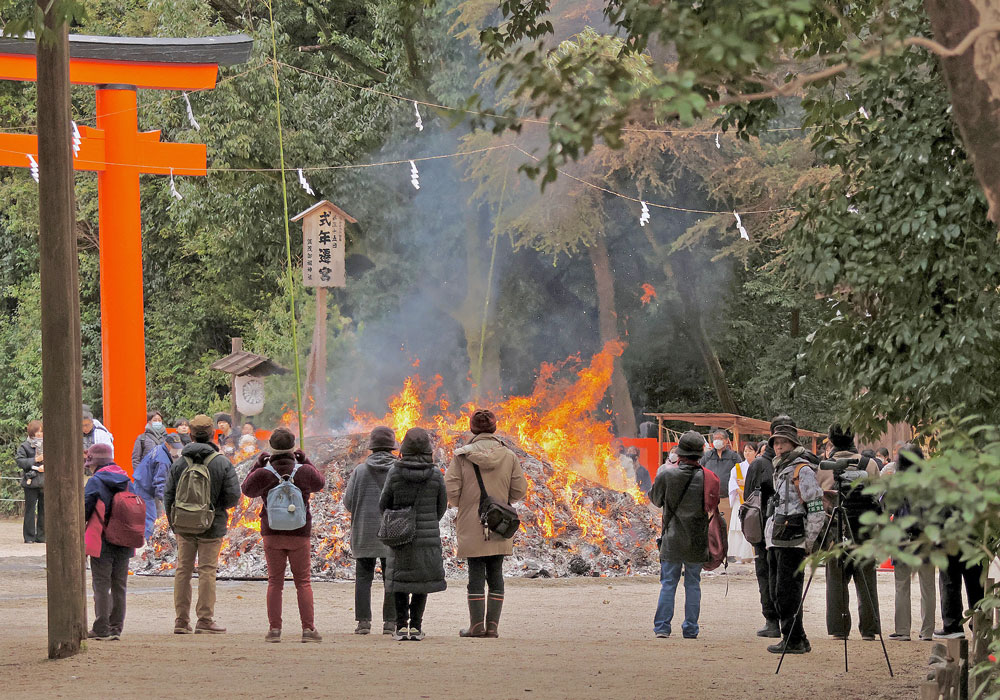 本殿近くの広場で節分のどんど焼きが行われているので回り道をすると、茂みにシロハラ、アオジが出現。参拝者が多いので足速に通り過ぎて河合神社へと向かう。途中の竜が池周辺にイカルの大群が降りているのを垣根越しに観察する。その後、河合神社前で1回目の鳥合わせ。