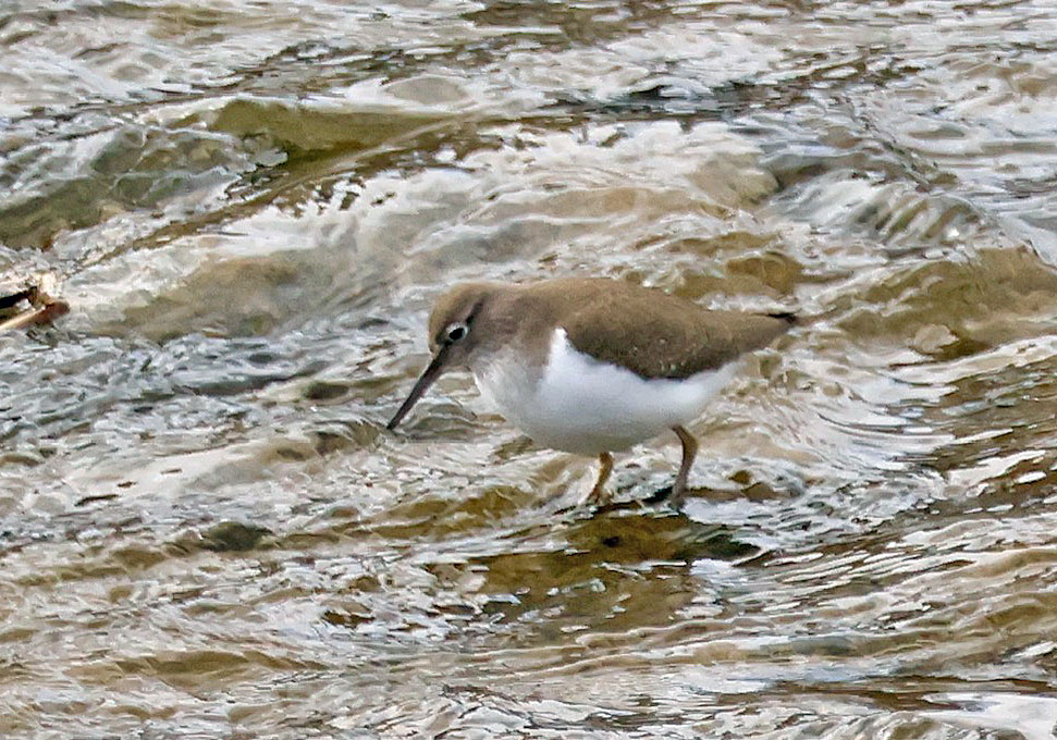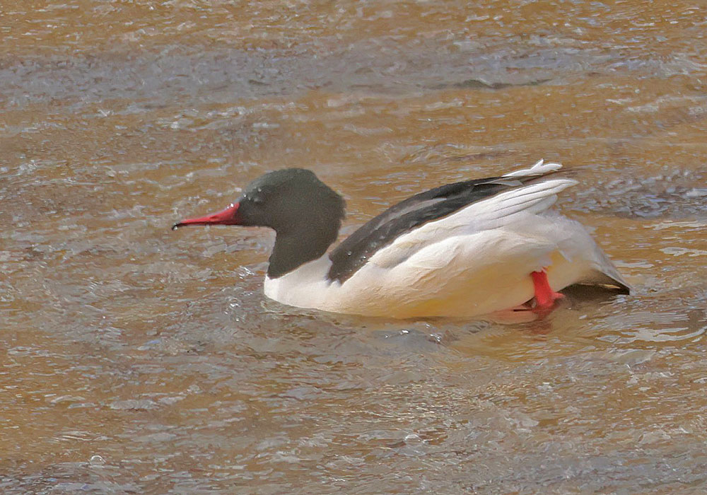 カワアイサが優雅に泳いでいる。日が当たると雄の頭部が緑色に輝いて美しい。イソシギ、カイツブリ、シメ、ムクドリなども出て、楽しい探鳥会となった。