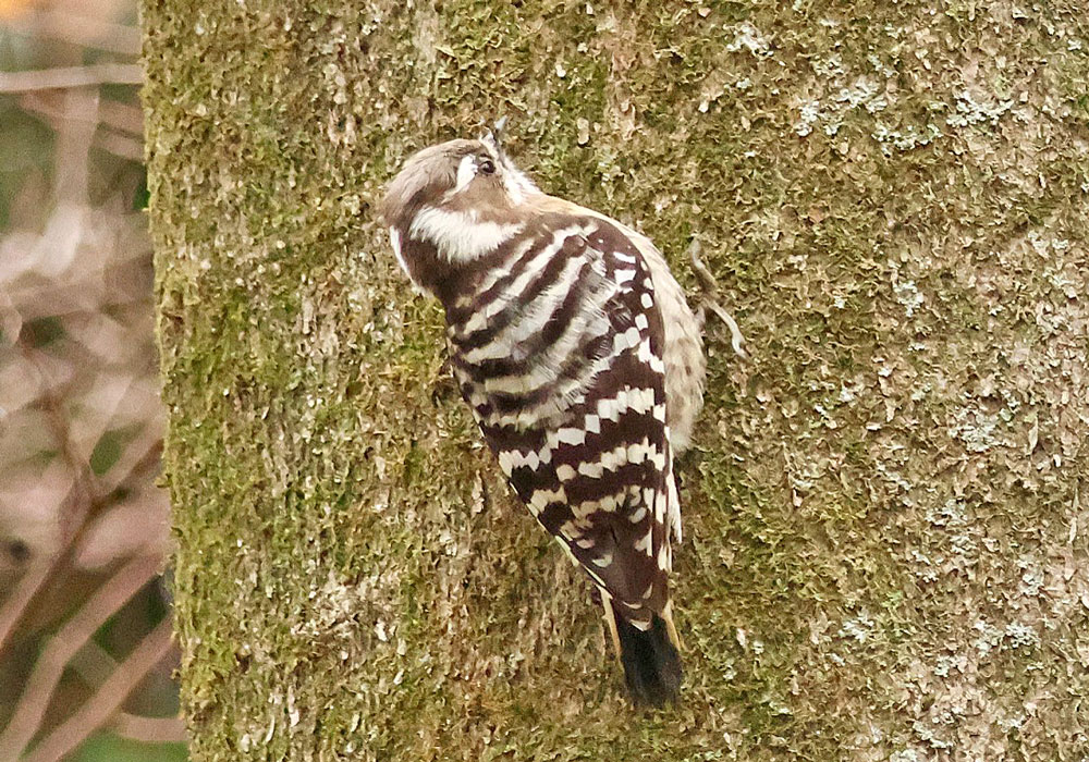 糺の森近くの木にイカルの群れが入っていたが、すぐに森の方向に飛んだ。森に入るとすぐ冬の混群に出会う。とりわけ数羽のコゲラが幹や枝を突き始め、参加者は双眼鏡で追いかけるのに余念がない。