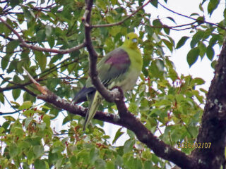 後半、アオバトやカワセミを探して歩きますが不発。しかし九条池で参加者の方が緑の葉の中にアオバト1羽を発見。ちゃんと隠れているつもりなのか、みんなが双眼鏡やスコープで見ても動じません。遅れて九条池に到着した初心者組もじっくりアオバトを観察できました。