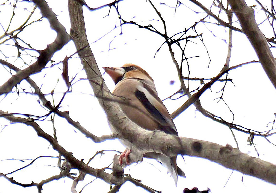 前日の好天と暖かさとはうって変わって、曇り空で冬が戻ってきたような寒さのなか出発します。桓武天皇陵から明治天皇陵に続く道では、ときおり上空を横切るツグミの群れとシメがいた他はヒヨドリとキジバト、カラスくらいで静かな滑り出しです。