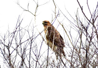 明治天皇陵では遠くの枯れ木にツグミとシメの混群がとまっているのを観察。ツグミは十数羽の群れがあちこちにいるようです。曇天なのでタカの出現は期待薄かと思っていたところ、頭上にノスリが出現。都合よく御陵後方の木にしばらく止まってくれたので、全員がゆっくりと観察することができました。