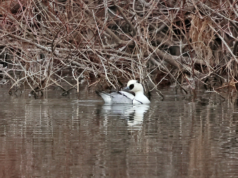 ヨシ原ではオオジュリンが何度も姿を現し、ベニマシコの声も…。予報通り気温がどんどん上昇して、半袖姿になる参加者もいます。佐紀池では目当てのミコアイサのほかハシビロガモなどがじっくり観察できました。水上池では対岸の木陰にようやくオシドリを発見。下見では確認できなかったトモエガモやヨシガモも見られました。