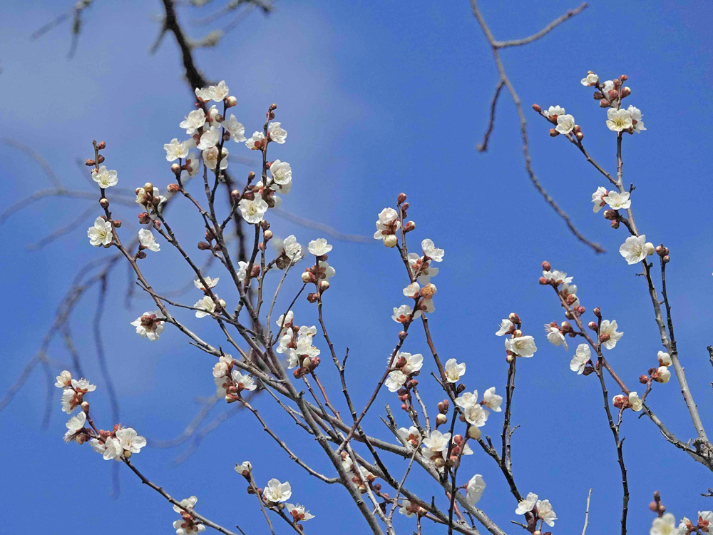 大覚寺では大沢池に水が戻っていたが、オオバン、ヒドリガモなど数羽ずつで水面は閑散としている。池畔の木立に鳥影も声もない。梅林の梅だけが目を楽しませてくれる。