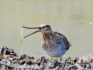 集合前の下見で確認したキジを探すものの、姿がありません。森の鳥を期待して咋岡(くいおか)神社へ向かう途中、田んぼのあぜにタシギを発見。小さな子供も含めて全員にじっくり見ていただきました。