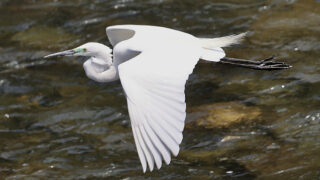宇治橋を渡って、観光客で賑わう平等院の参道を避けて裏道へ行くと、キャッチフレーズどおりヒレンジャクが3羽姿を現し、担当者としては一安心。しかし、宇治川上流部へ足を運ぶと、釣り人が多いせいか水鳥がほとんどいません。それでも、順光で構造色が美しいマガモや、対岸のイソシギなどを観察。下流で見た冬羽のダイサギは、上流では目先が青い婚姻色の夏羽になっていて、鳥たちが繁殖期を迎えていることを実感しました。
