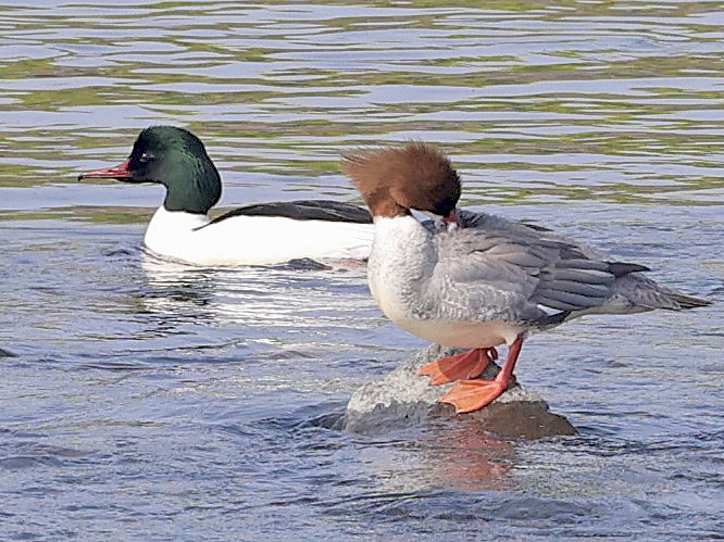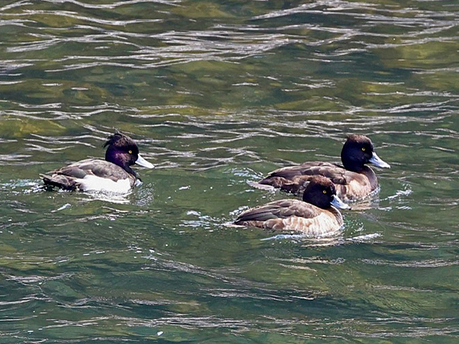 数日前の下見では鳥が不在だった下流の中州付近に、当日朝の下見ではカモ類が集まり、駅北の陵墓のサギコロニーにはアオサギが巣材運びを始めていたので、まず下流へ。キンクロハジロやオカヨシガモ、カワアイサをじっくり見ていただき、引き返す際にはカワセミも登場しました。